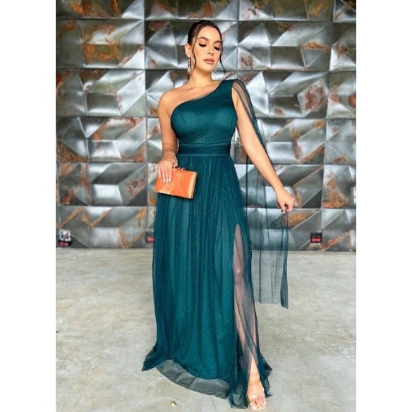 Vestido Longo De Festa Madrinha Casamento Formatura Um Ombro Tule Com Brilho