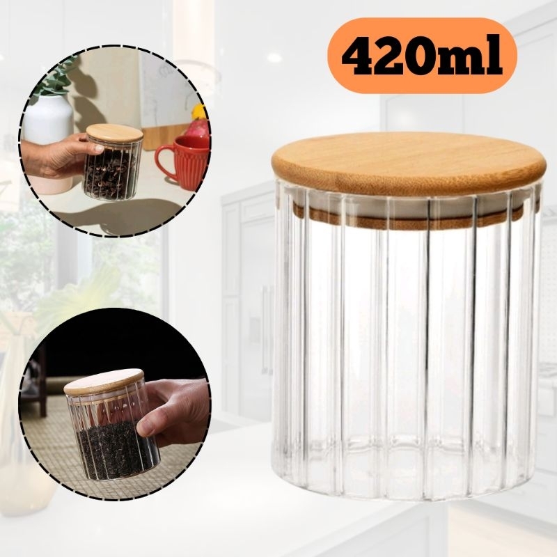 Pote de Vidro Canelado Com Tampa De Bambu 420ml Borossilicato