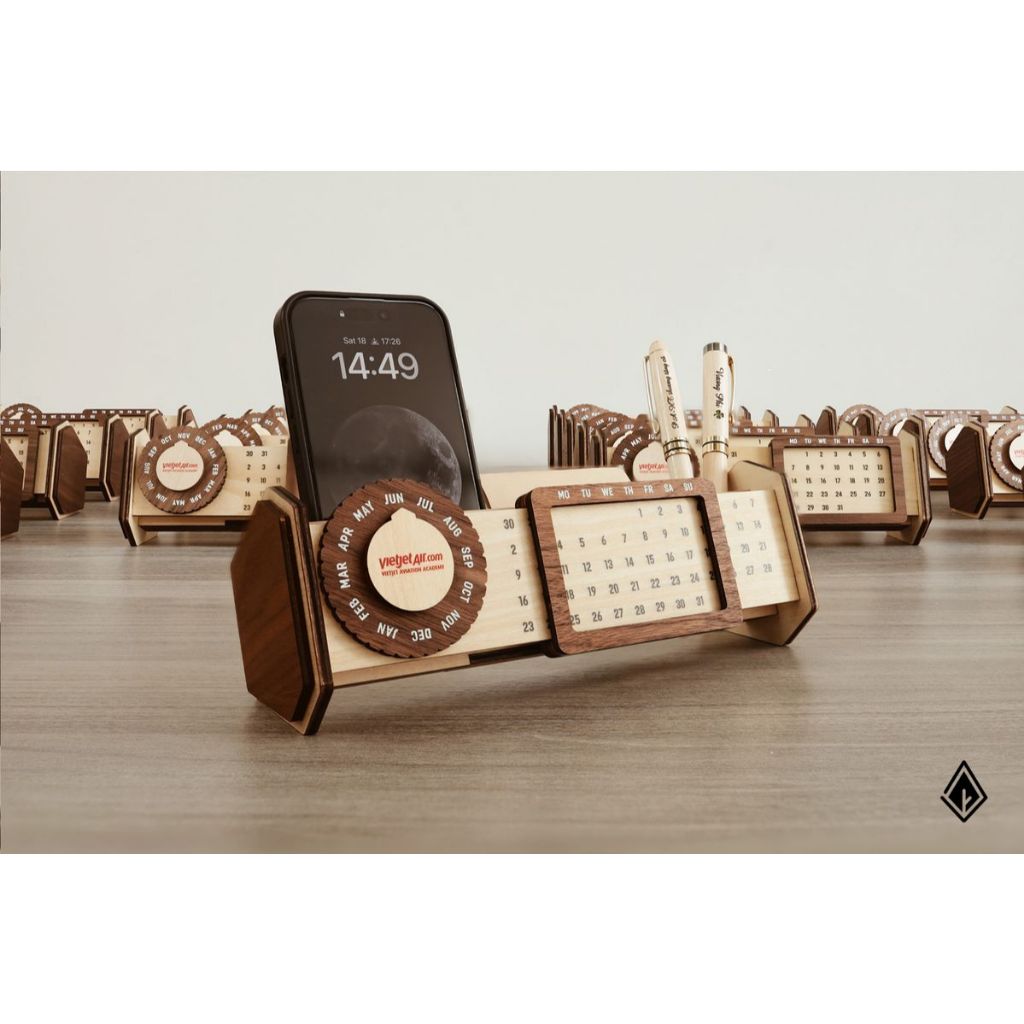 Organizadores de Mesa em Madeira | Suporte de Celular, Calendário Perpétuo e Porta-Caneta | Edição Exclusiva