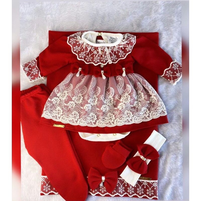 kit Saida de Maternidade Princesa Menina Tricot tricô Vestido Recém Nascido Vermelho Amarelo Lilás Verde rosa azul