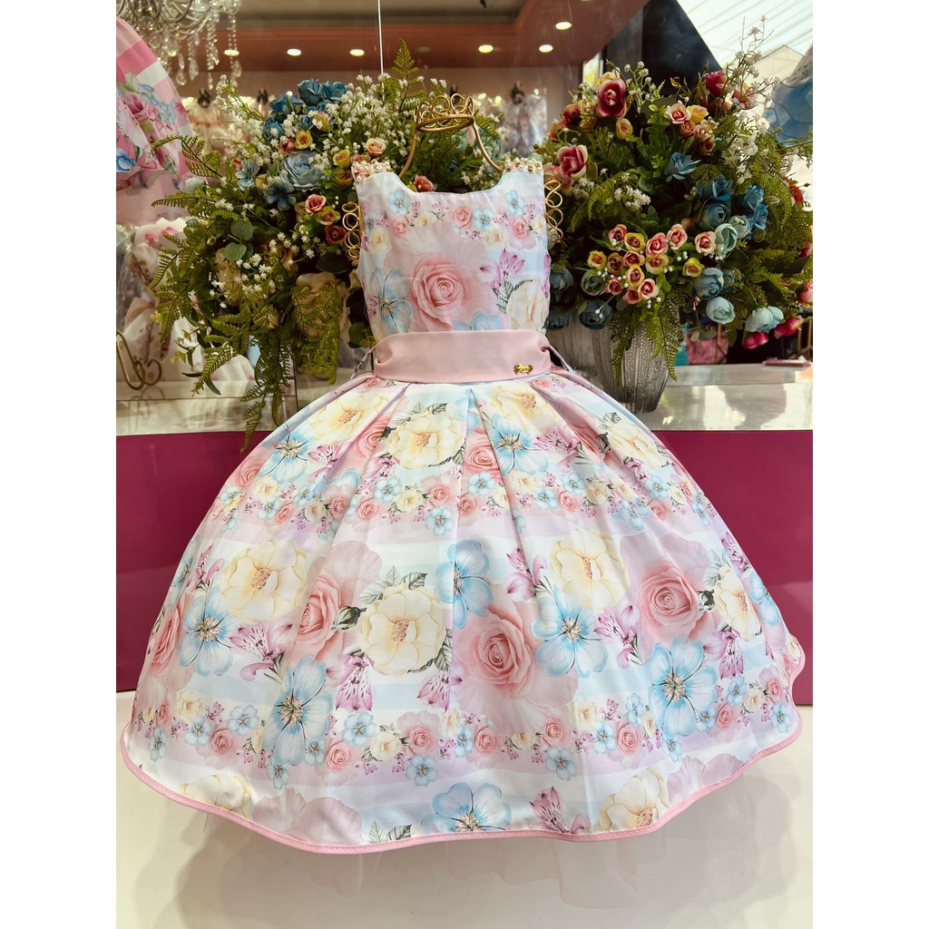 Vestido Infantil Luxo Floral Rosa Com Azul - 4 ao 12