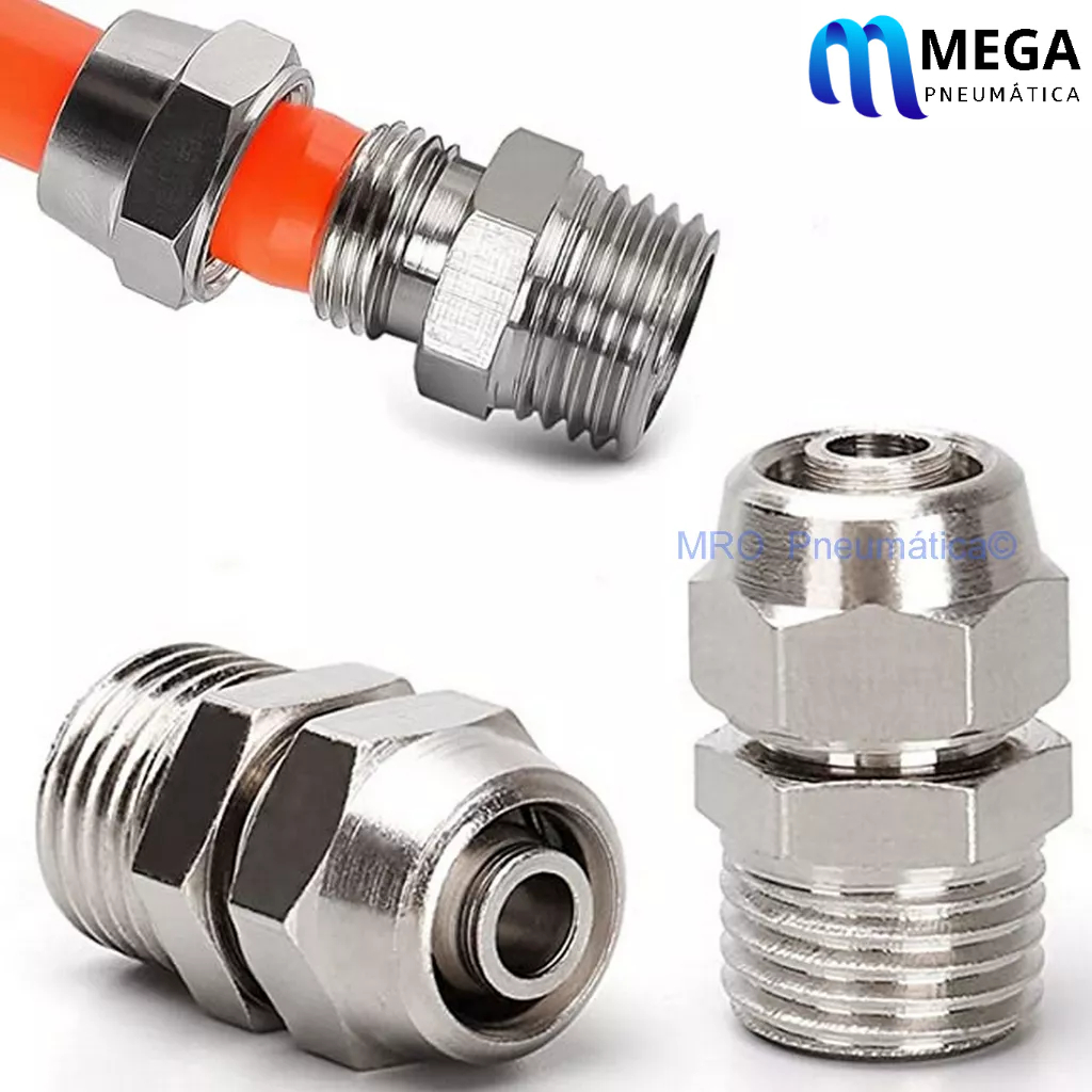Conector RETO Pneumático Rosca BSP - METALICO LATAO CROMADO - MODELO DOIS TOQUES - EMBALAGEM COM 1 PEÇA