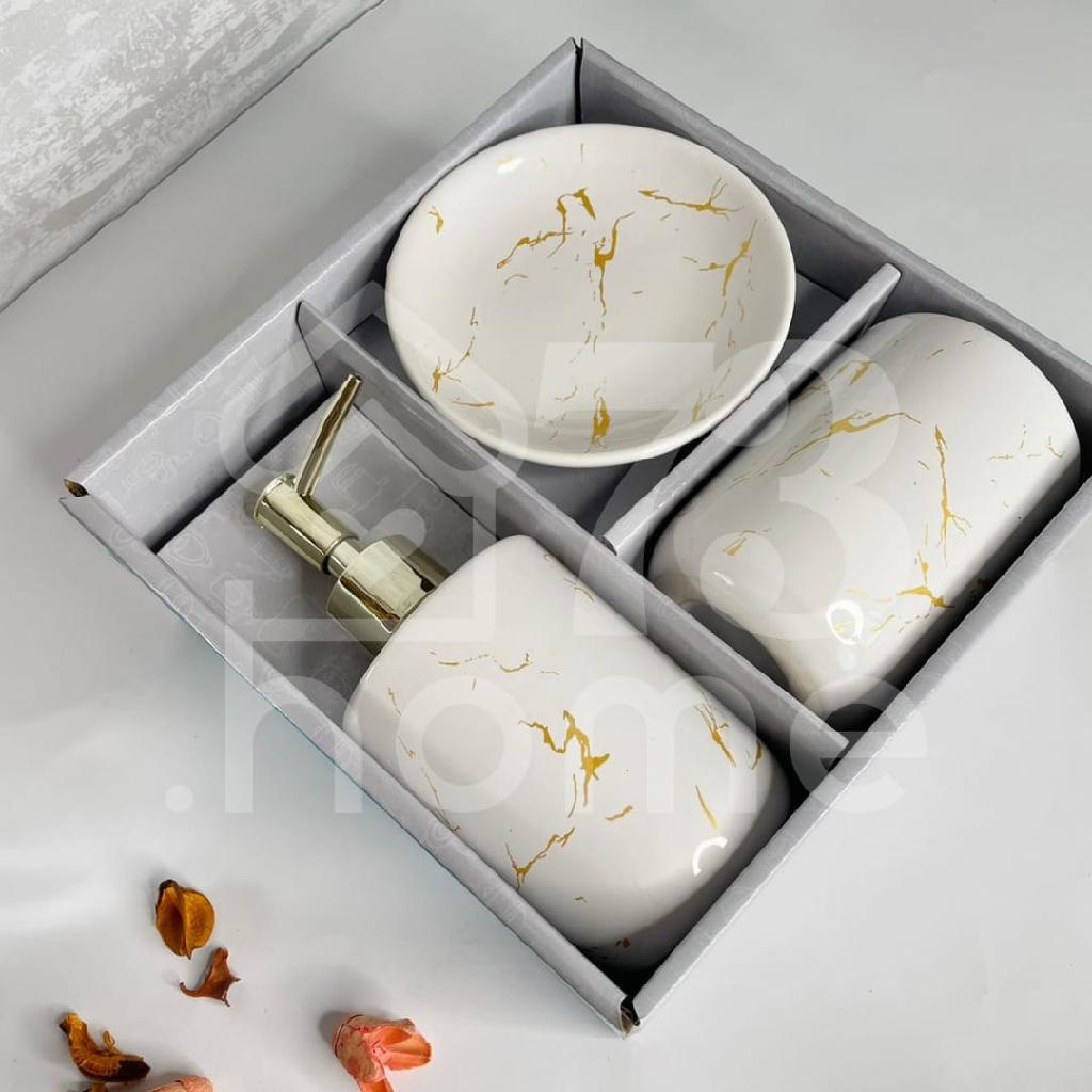 Conjunto kit de cerâmica 3 peças marmorizado banheiro lavabo - Saboneteira porta sabonete liquido porta escovas