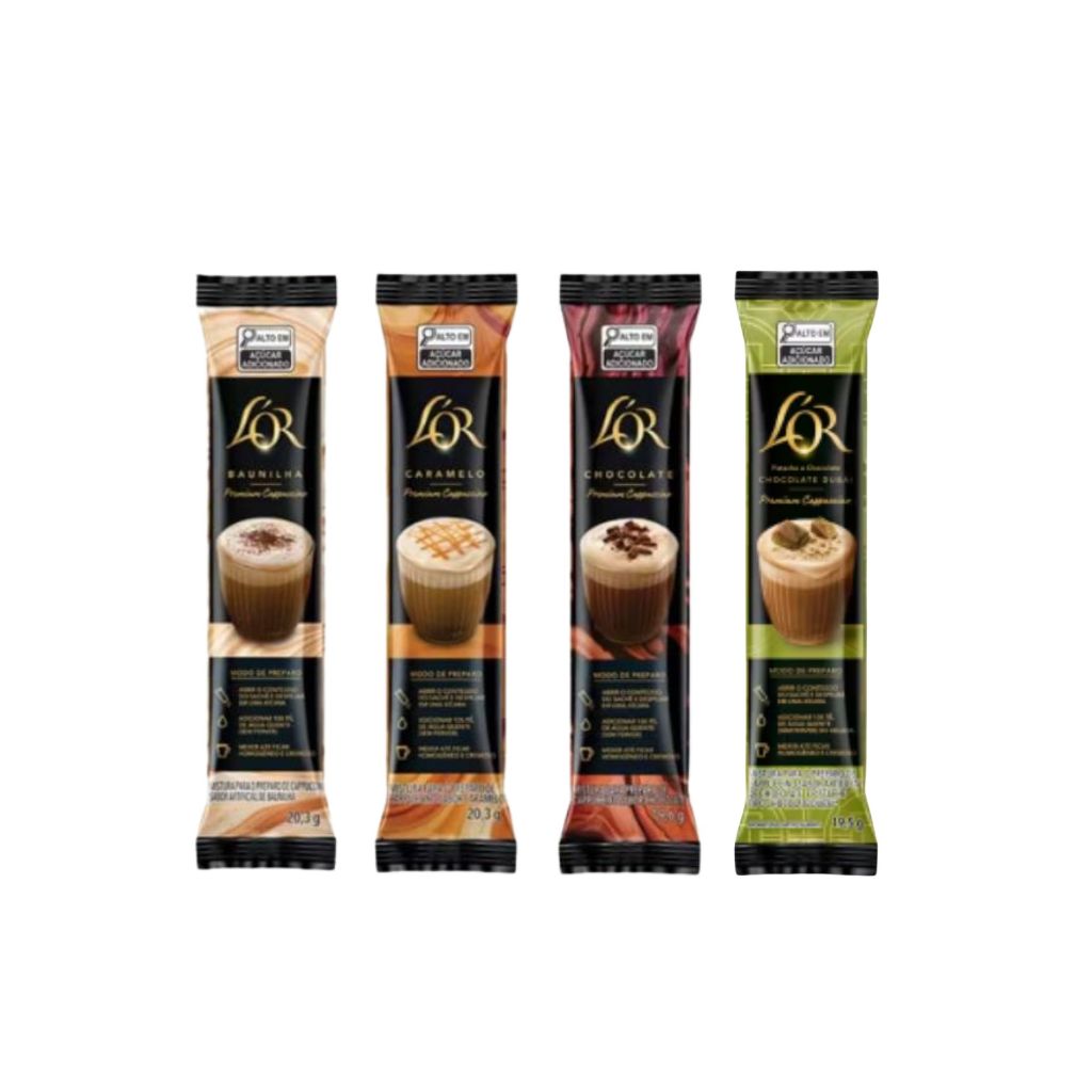 Kit com 40 Sachês de Cappuccino LOR Sabores, Baunilha Caramelo Chocolate e Pistache Café Instantâneo Cremoso Premium