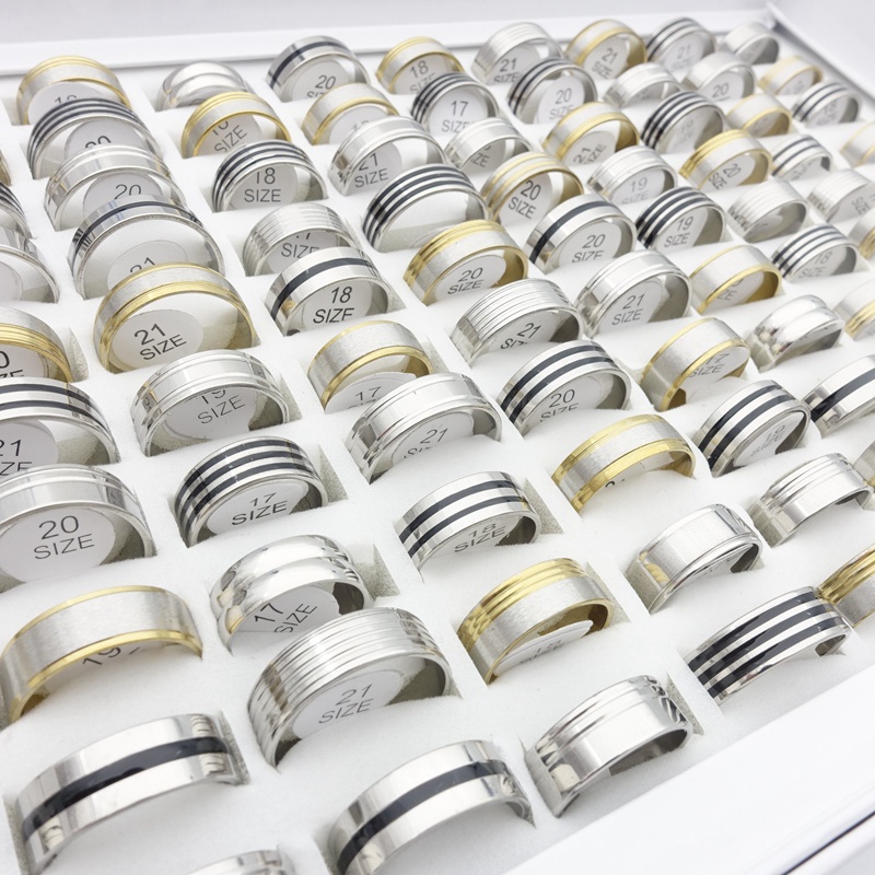 Atacado 50pcs Anéis Femininos Homens Aço Inoxidável Ouro Preto Prata Padrões De Listras Fashion Jewelry