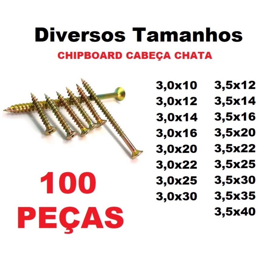 Parafuso Chipboard 3.0 mm e 3.5 mm para Madeira Cabeça Chata Philips 100 Peças