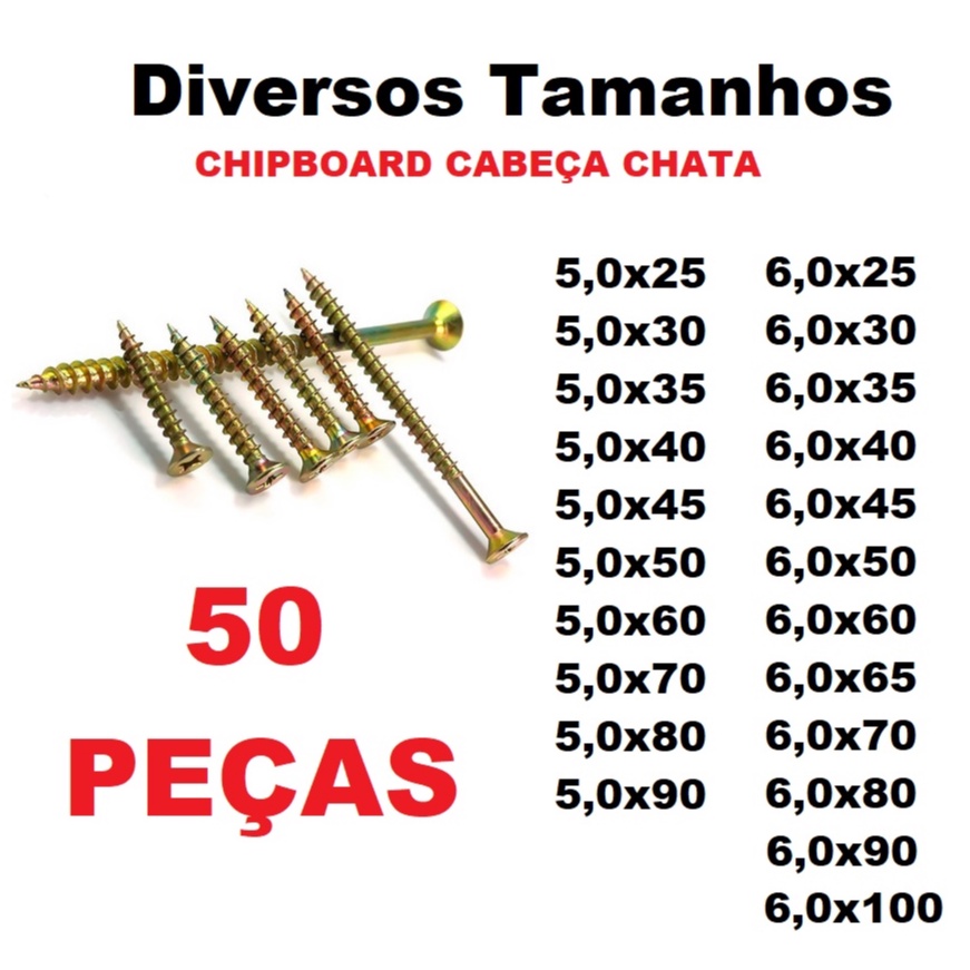 Parafuso Chipboard 5.0 mm 6.0 mm para Madeira Cabeça Chata Philips - 50 PEÇAS