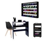 Kit Para Manicure Com Mesa + Prateleira de Esmaltes + Carrinho Auxiliar com 3 Bandejas e Rodinhas MDF Preto