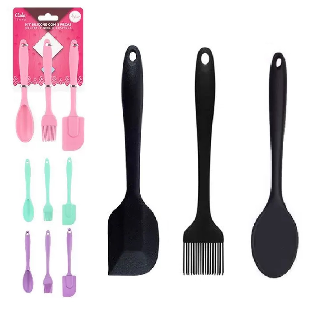 Kit Cozinha 3 Peças de Silicone Colher + Pincel + Espátula