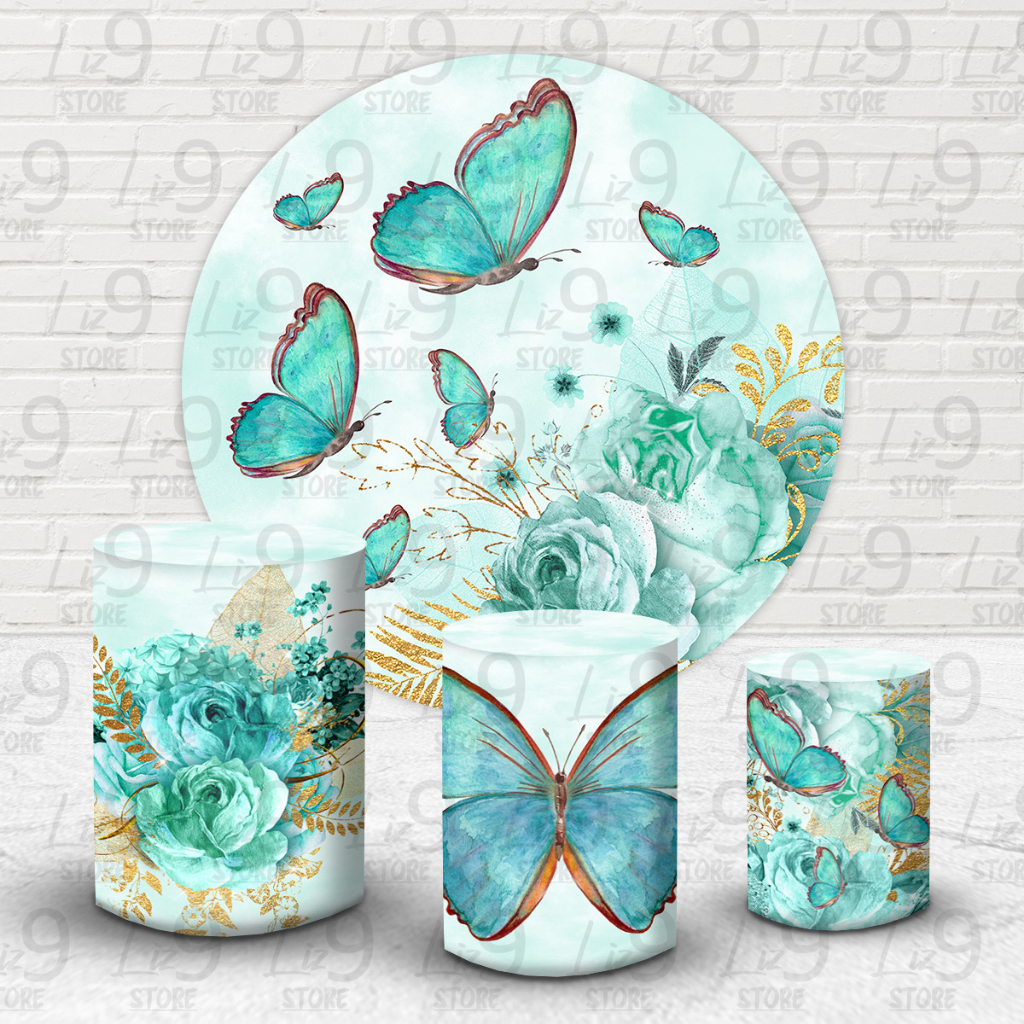 Kit Painel Redondo Sublimado Borboletas 1,50M + Trio Capas de Cilindro C/Elastico Veste Facil
