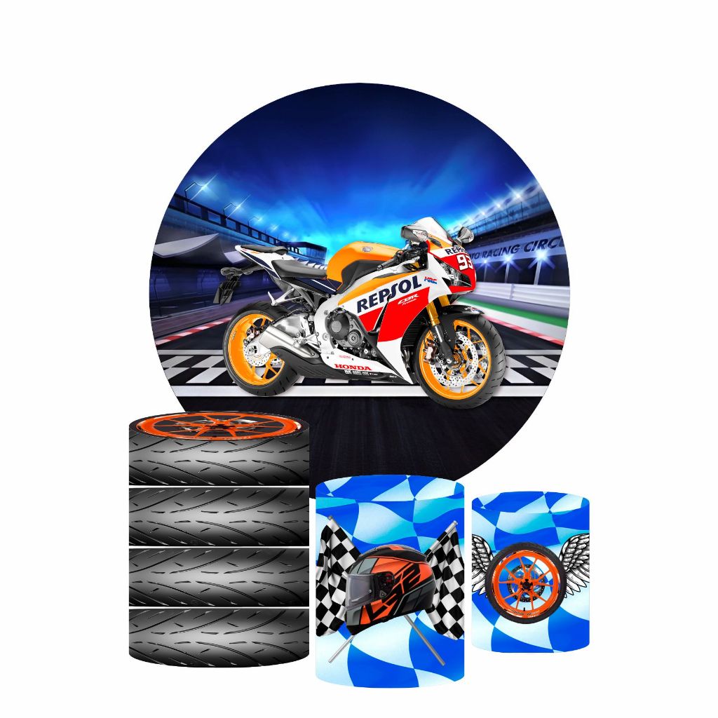 Kit Painel de Festa Redondo 1,5 + Trio Capas Cilindro Tema Moto Motocicleta Motocross