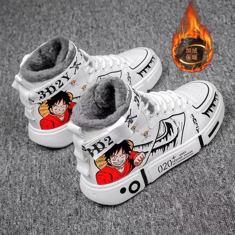 [Envio Rápido] 2023 Calçados Masculinos Da Moda Japonesa Anime Pirates One Piece Luffy Confortável E Tênis Preto Bonito High Top Sneakers (plush)