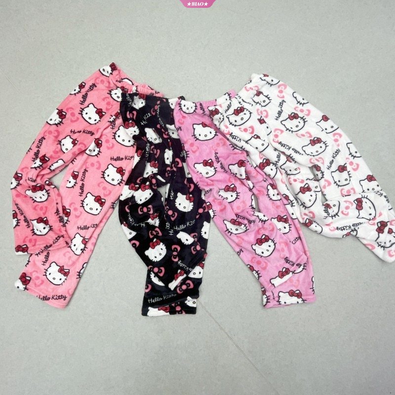 Lindo Sanrio Cartoon Pijamas Anime Hello Kitty Calças De Flanela Multicolor Mulher Casual Home Moda Menina Roupa Presente