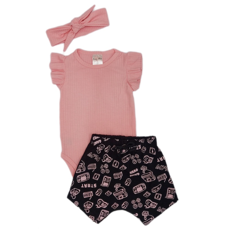 Conjunto Bebê Body Babado Shorts bebê Tiara Nó