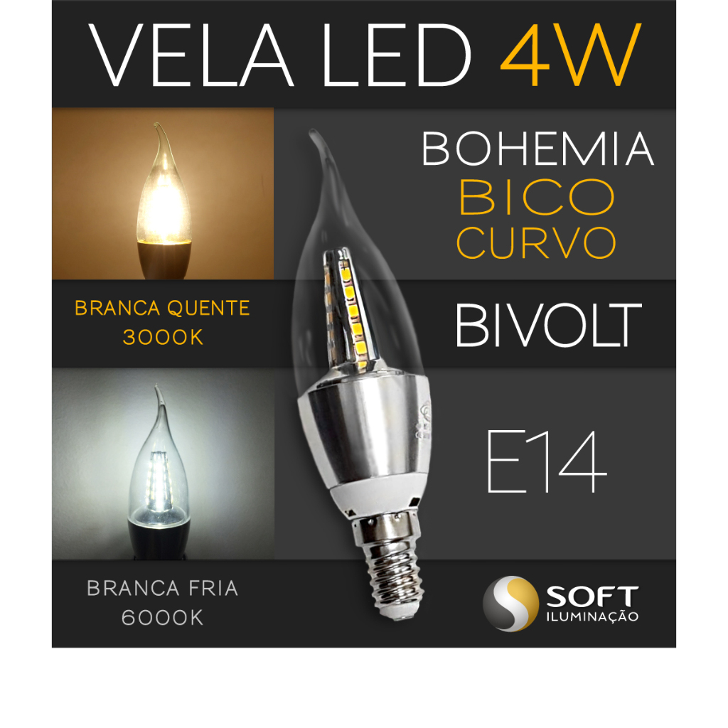 Kit 3 Lâmpadas Vela LED Bohemia (Bico Curvo) 4W Bivolt E14 Luz Branca Quente ou Branca Fria - Lustres | Arandelas | Abajures | Decoração Salas Quartos Comercio