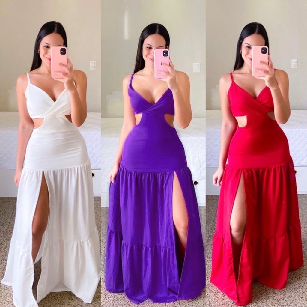 Vestido Feminino Alcinha Longo Com Decote e Abertura Lateral Moda Blogueira