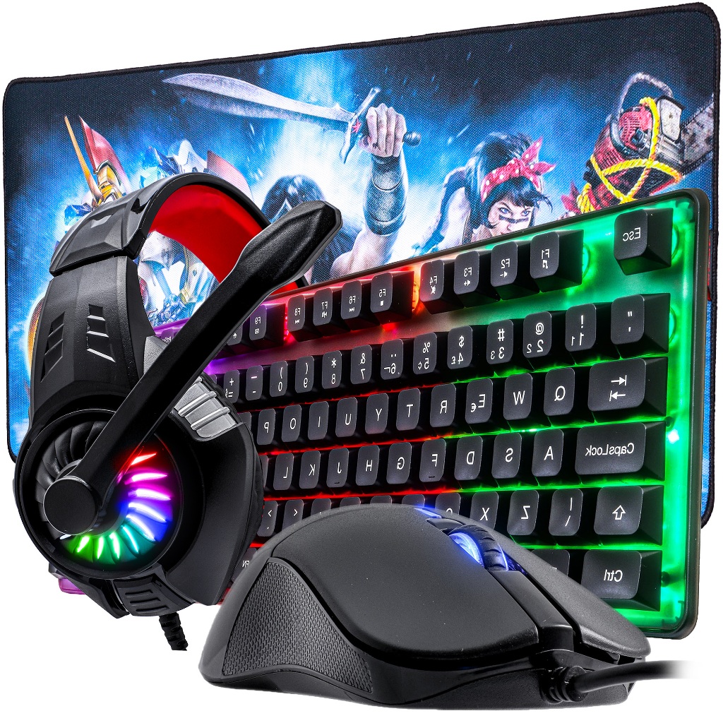 Kit Gamer Teclado Semi-mecânico RGB, Mouse RGB, MousePad LED Preto, Mousepad Mundo, Headphone Fone