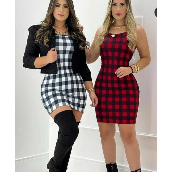Vestido xadrez tipo tubinho de alcinha canelado moda feminina estilo blogueira