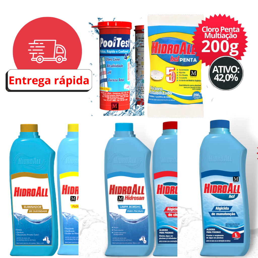 Algicida Choque e Manutencao , Clarificante , Pastilha Cloro Penta, Eliminador de Oleosidade, Fita Teste, Limpa Bordas Hidorall- Pedido Fácil