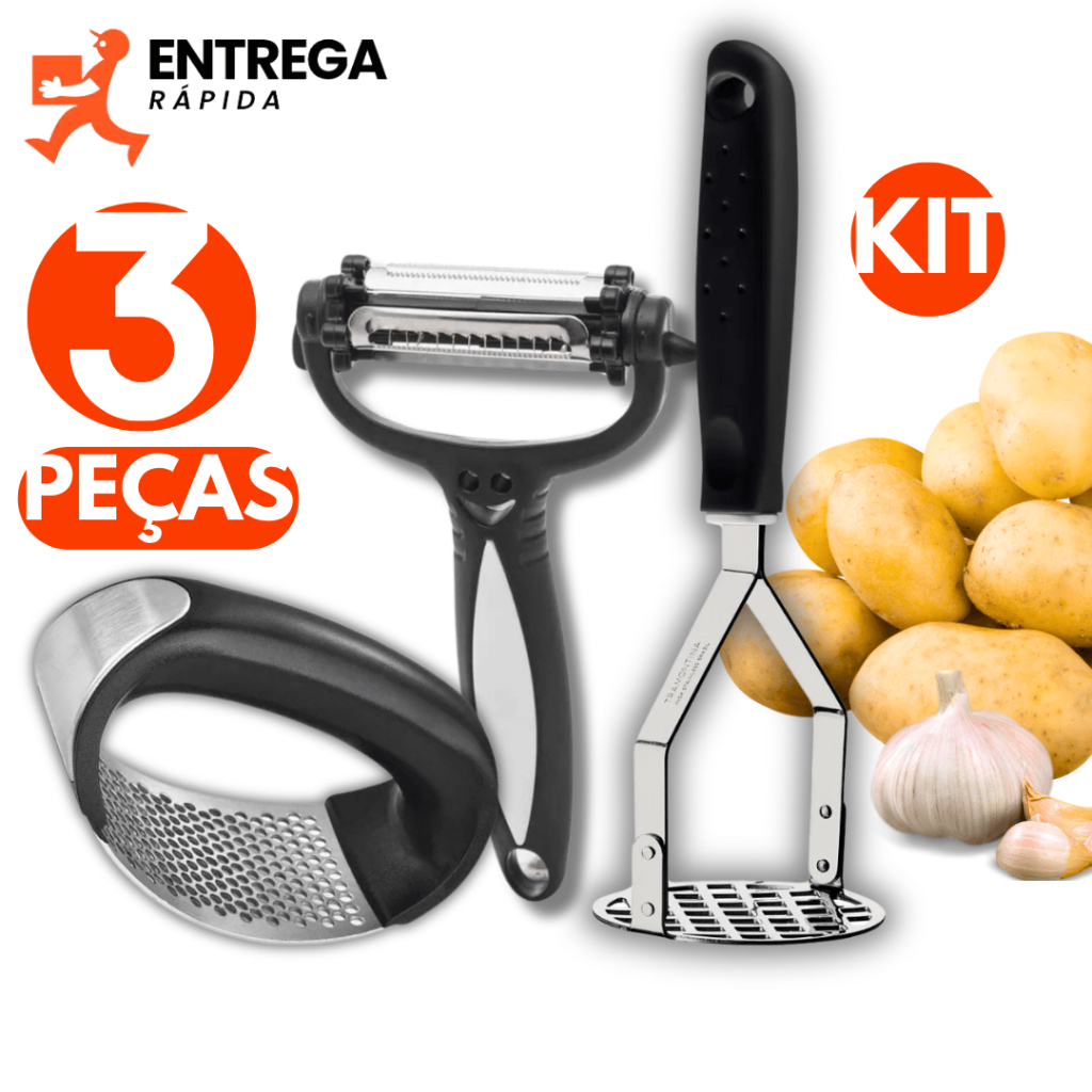 Kit Peças Descascador de Legumes 3 em 1 Amassador de Batata Inox com Cabo Plástico Espremedor de Alho Inox com Plástico