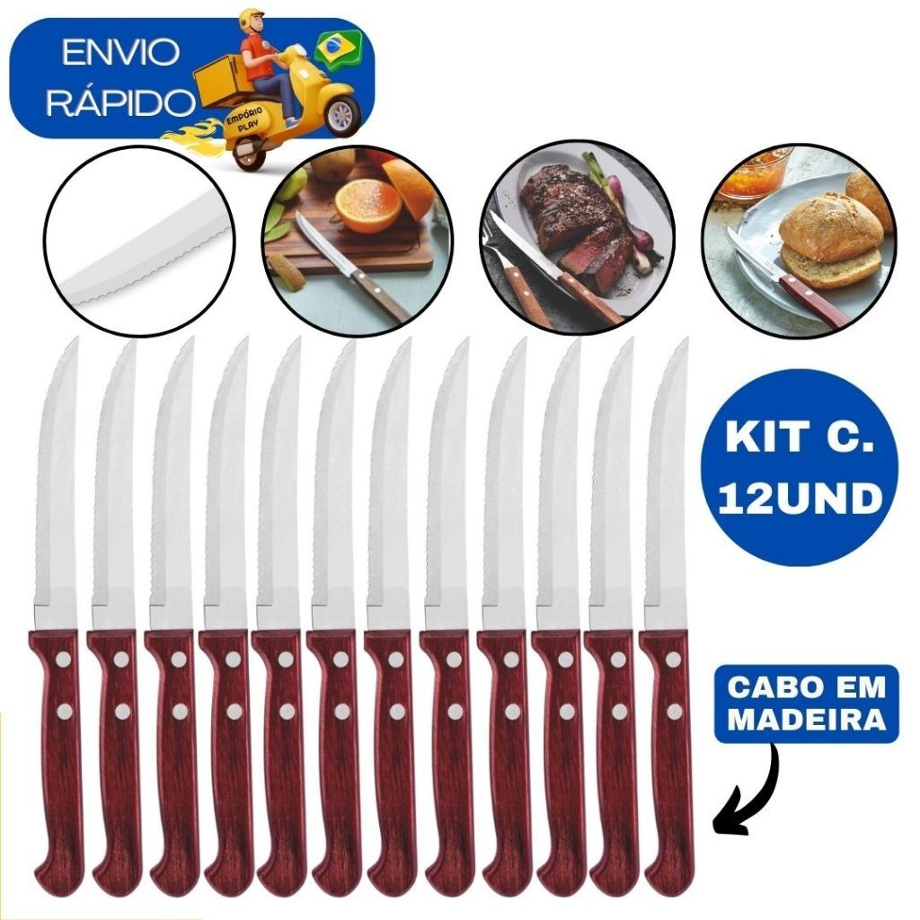Jogo 12 Facas Inox de Mesa Com Cabo Em Madeira Casa e Restaurante Churrascaria Churrasco Kit Jogo 1 Dúzia