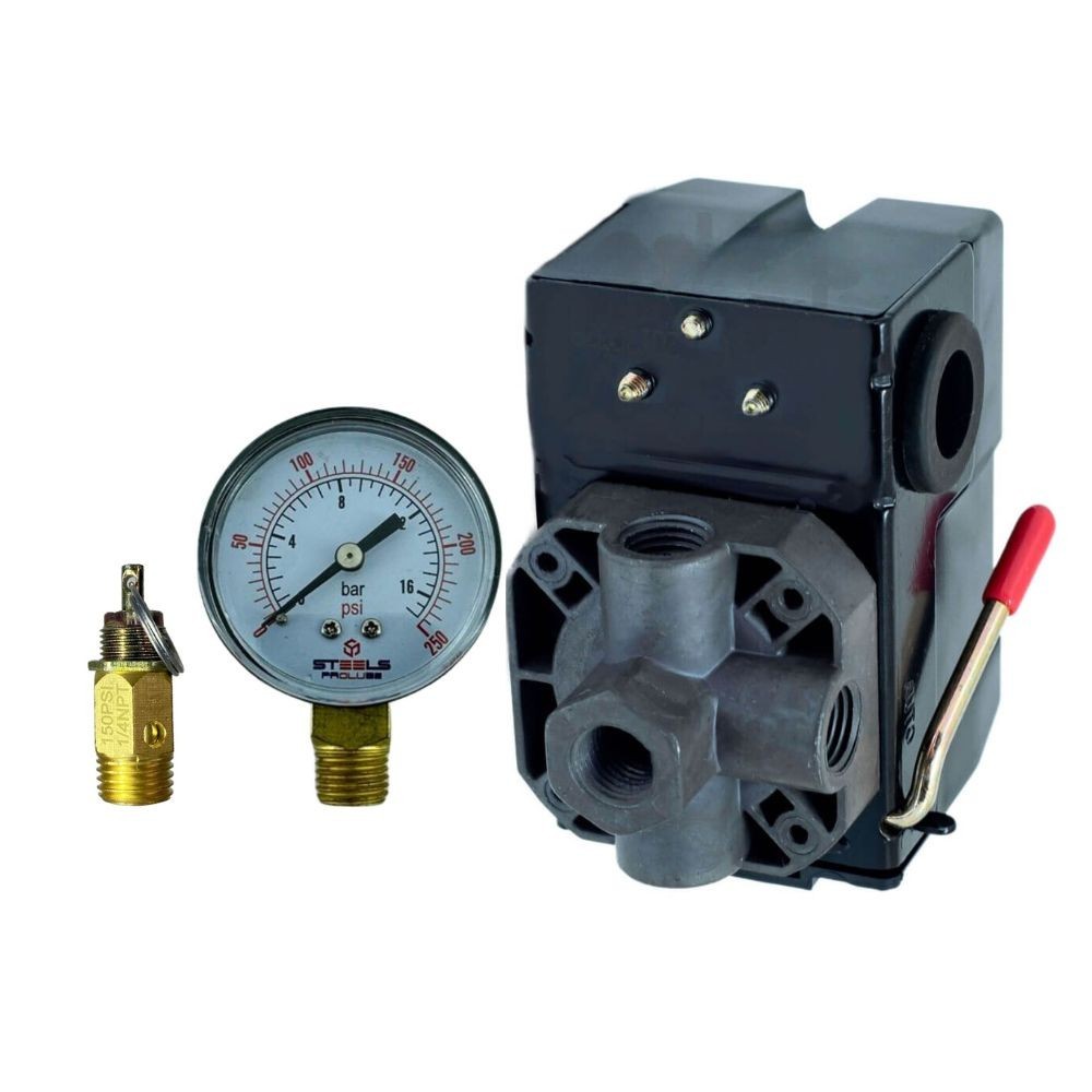 Kit Para Compressor de Ar Com Pressostato 100/140 PSI 4 Vias + Válvula de Segurança e Manômetro