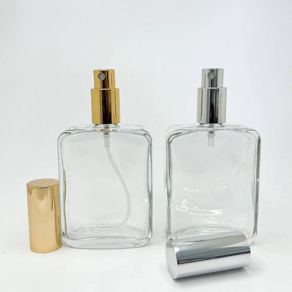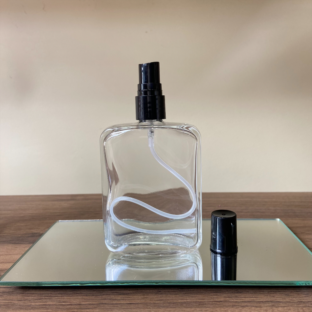 01 Frasco de vidro quadrado para perfume com válvula spray luxo 100ml