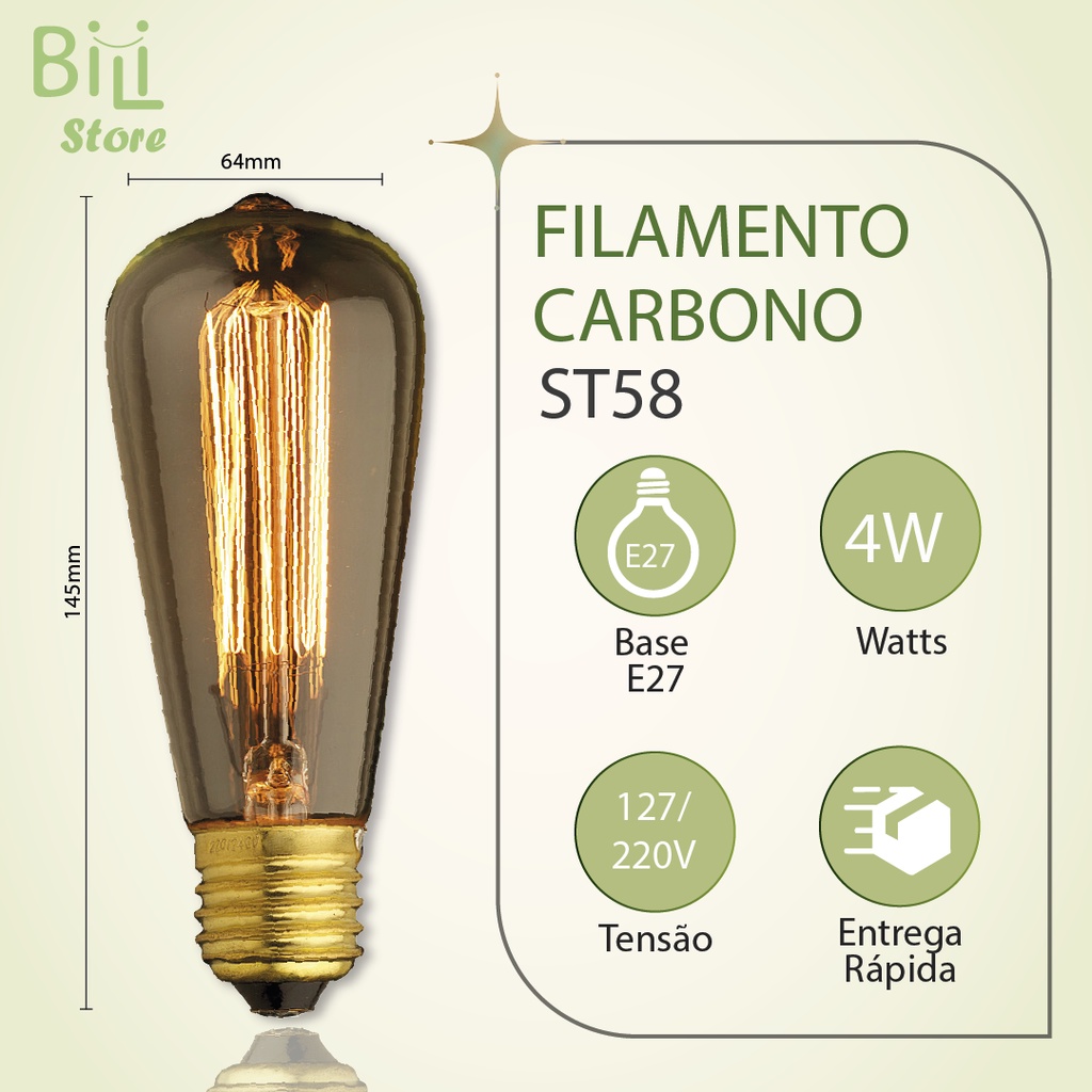 Lâmpada Filamento Carbono ST58 40W E27 LUZ QUENTE (AMARELO) Âmbar 110V~220V