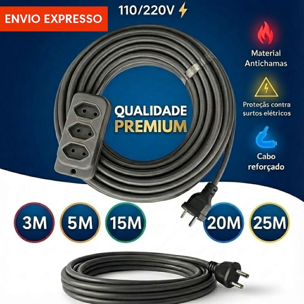 Extensão elétrica CABO PP 2X2,5MM - 10A/20A REFORÇADA - 2/3/5/10/15/20/25 (METROS)