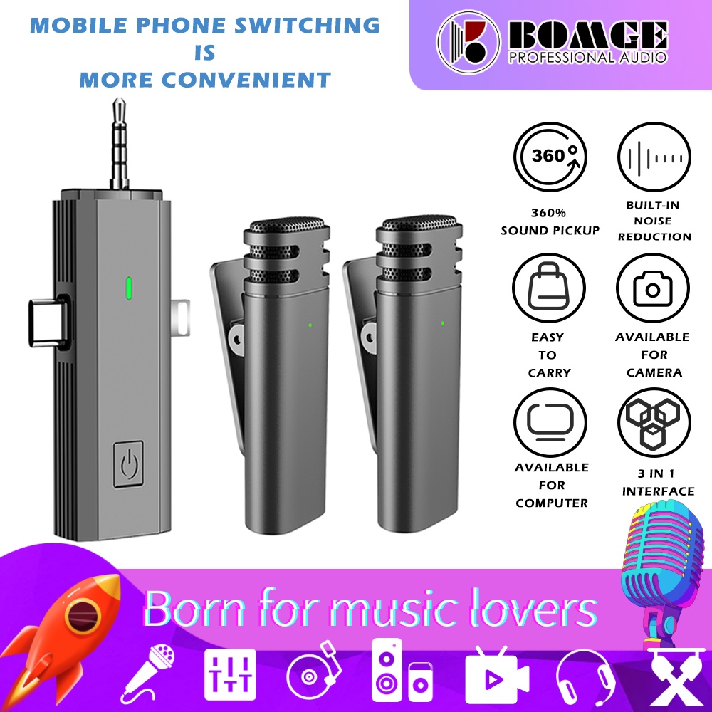 BOMGE Microfone Lapela Duplo Sem Fio Para Android , Microfones Duplos Plug-Play 2.4G Ultra Baixo Atraso Incluso Chip De Redução De Ruído 7H Tempo De Trabalho De Longa Duração
