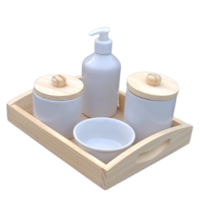 Kit Higiene Bebê Porcelana Branca Com Tampa Bandeja Madeira Maternidade Unisex