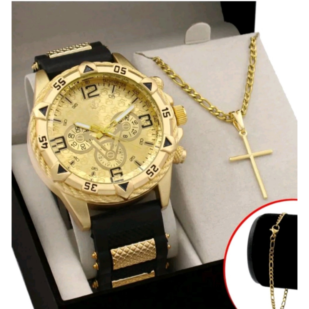 Kit Relogio Masculino + Corrente Cruz 18k Banhado a Ouro Original