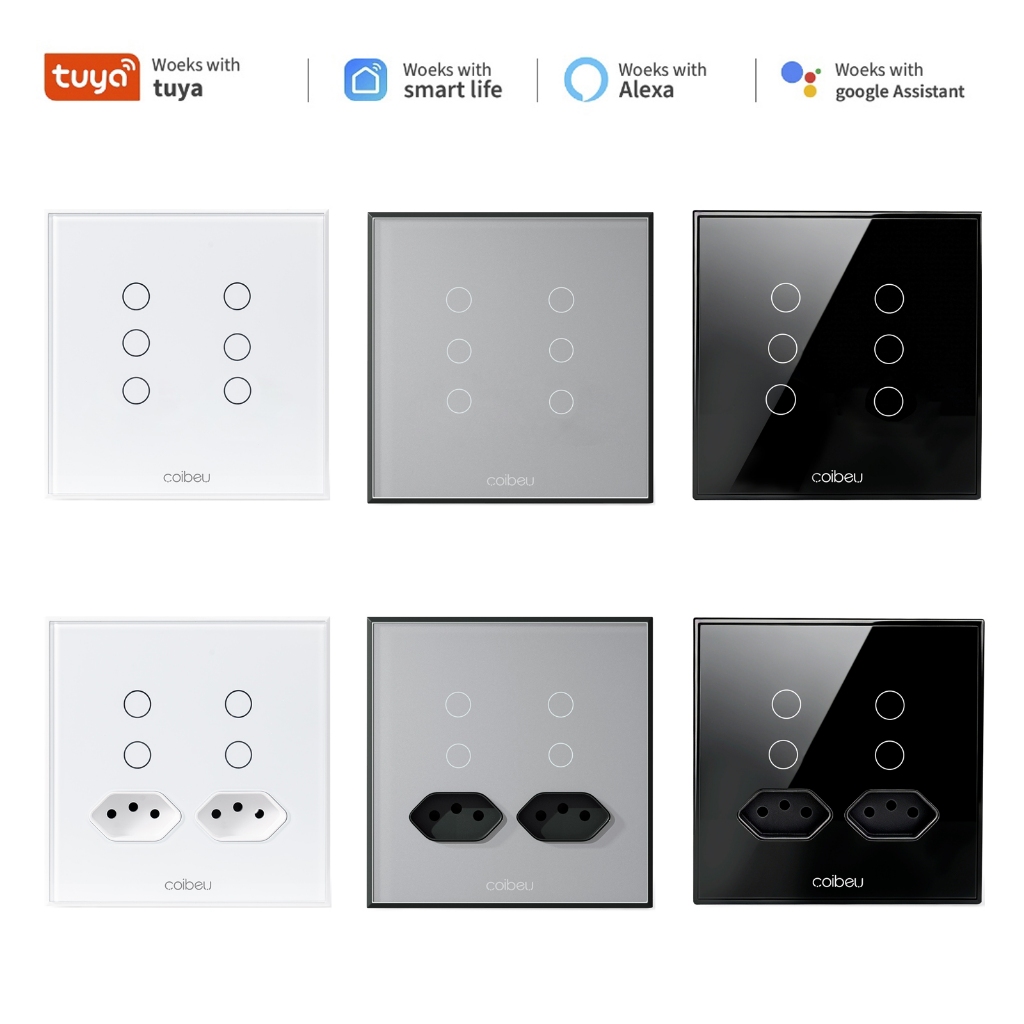 COIBEU Interruptor Inteligente WiFi Com Painel De Vidro De Toque De Soquete Botão De Saída Funciona Tuya Alexa Google 1 Interruptor e 1 Tomada