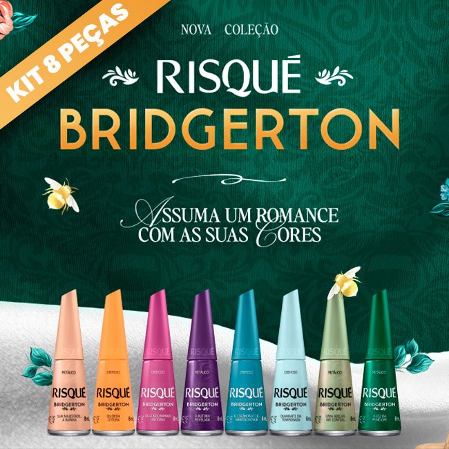 Kit Esmalte Risqué Bridgerton Coleção com 8 cores - Querida Leitora, A Autora Revelada, Diamante da Temporada, Sua Majestade, a Rainha, Uma Abelha me Contou, A Vez da Penélope, Regendo Minha História e Escândalo de Whistledown. Lançamento
