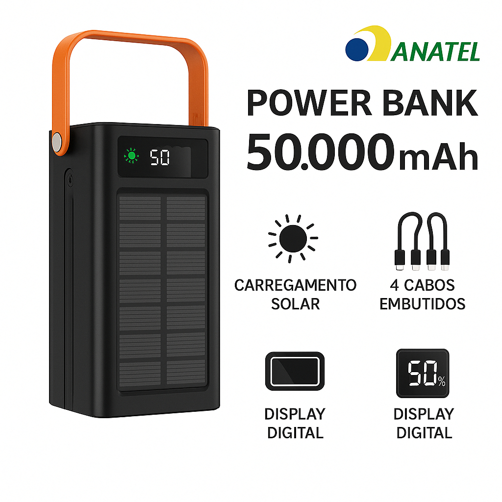 Carregador Portátil Power Bank 50.000mah com 4 Saídas V8 USB Tipo C Lightning Micro USB Carregamento Rápido - Luz solar
