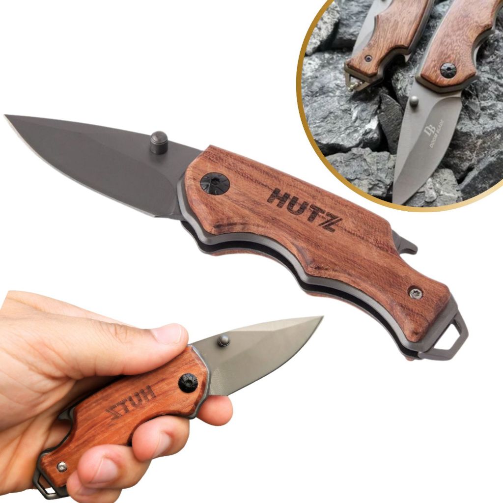 Canivete Tático Militar Americano Retrátil De Bolso Faca Camping Pesca Caça Aço Inox Madeira 077