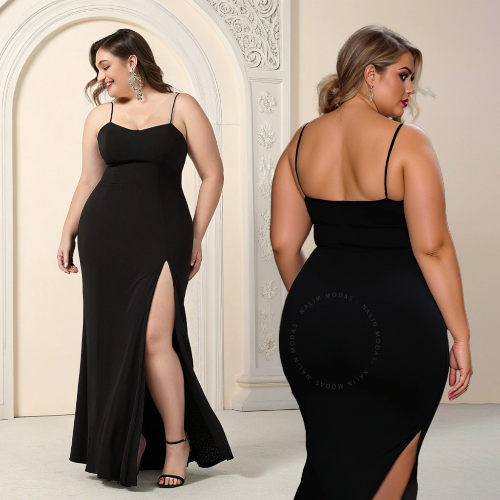 Vestido Longo Plus Size com Fenda Lateral Alça Liso Preto Elegante Premium Feminino