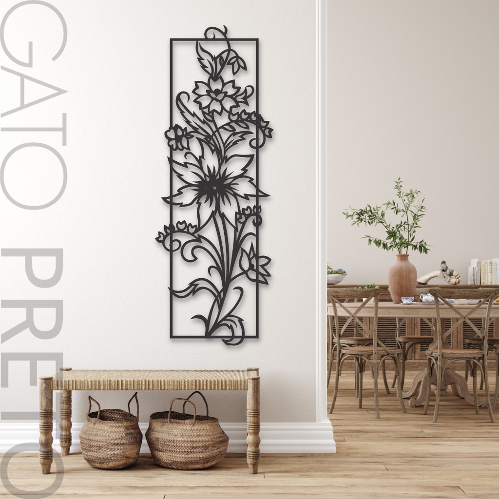 Placa Quadro Decorativo Mural de Flores Vertical Planta Jardim Quarto Sala Flores Madeira MDF Preto Fosco