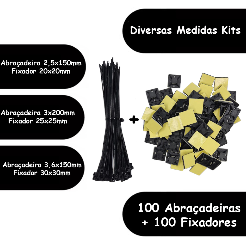 Kit 100 Fixadores Auto Adesico Dupla Face + 100 Abraçadeiras Enforca Gato - Escolha as medidas
