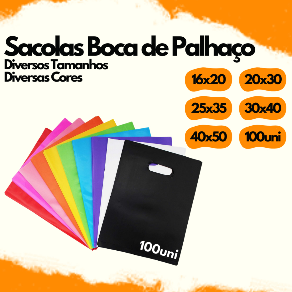 Kit 100uni Sacola Plástica 16x20 20x30 25x35 30x40 40x50 Boca De Palhaço Alça Vazada Diversas Cores
