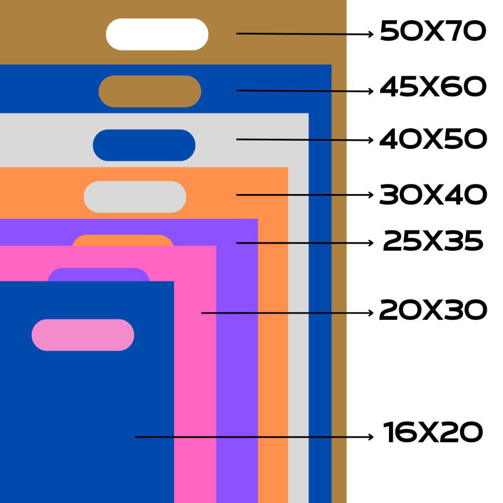 kit 100 Sacolas Plástica temos as medidas 40x50, 30x40, 25x35, 20x30 e 16x20 Alça Boca De Palhaço