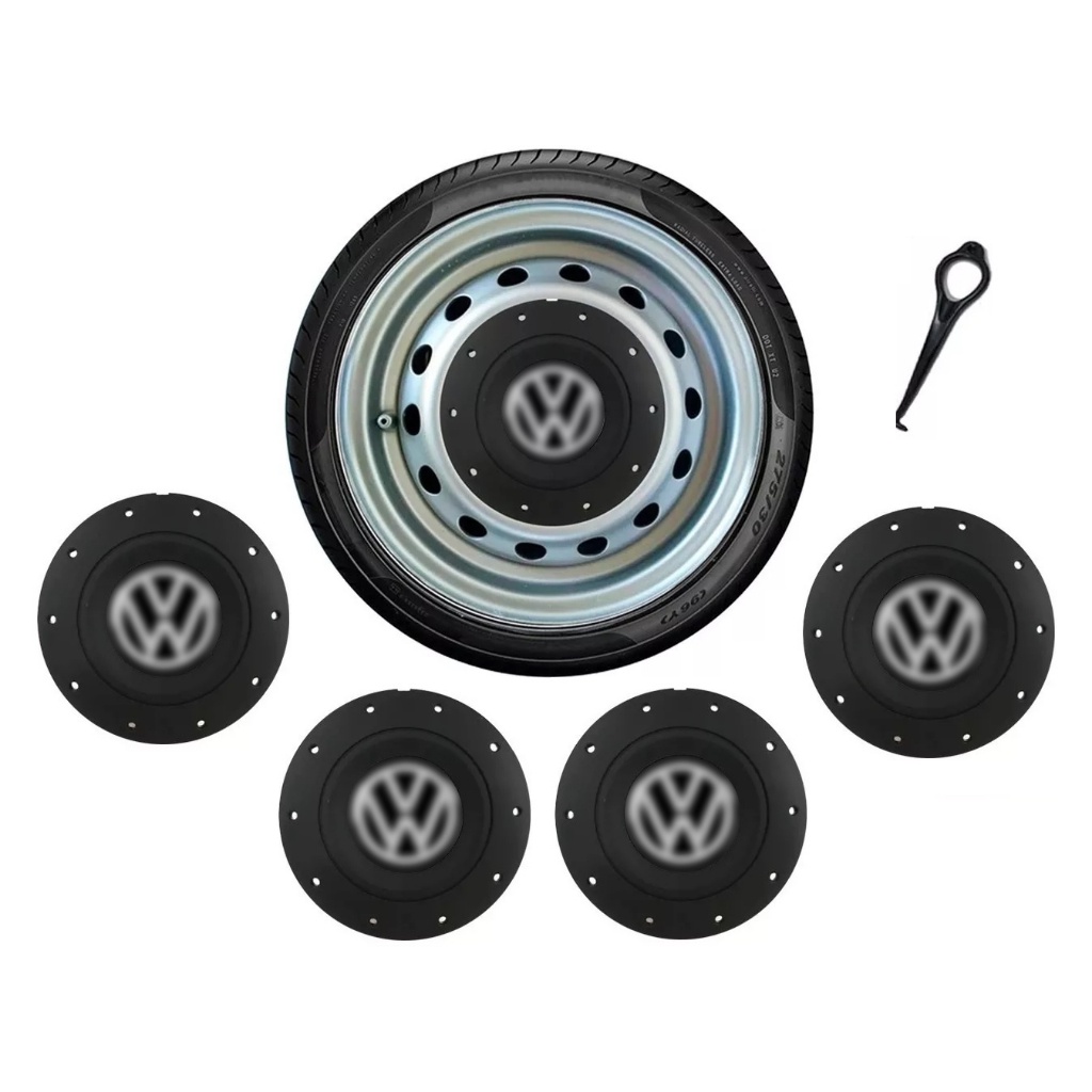 Jogo com 4 Calotas Centro Roda Ferro VW Amarok Aro 13 14 15 4 Furos Preta + Chave e adesivo