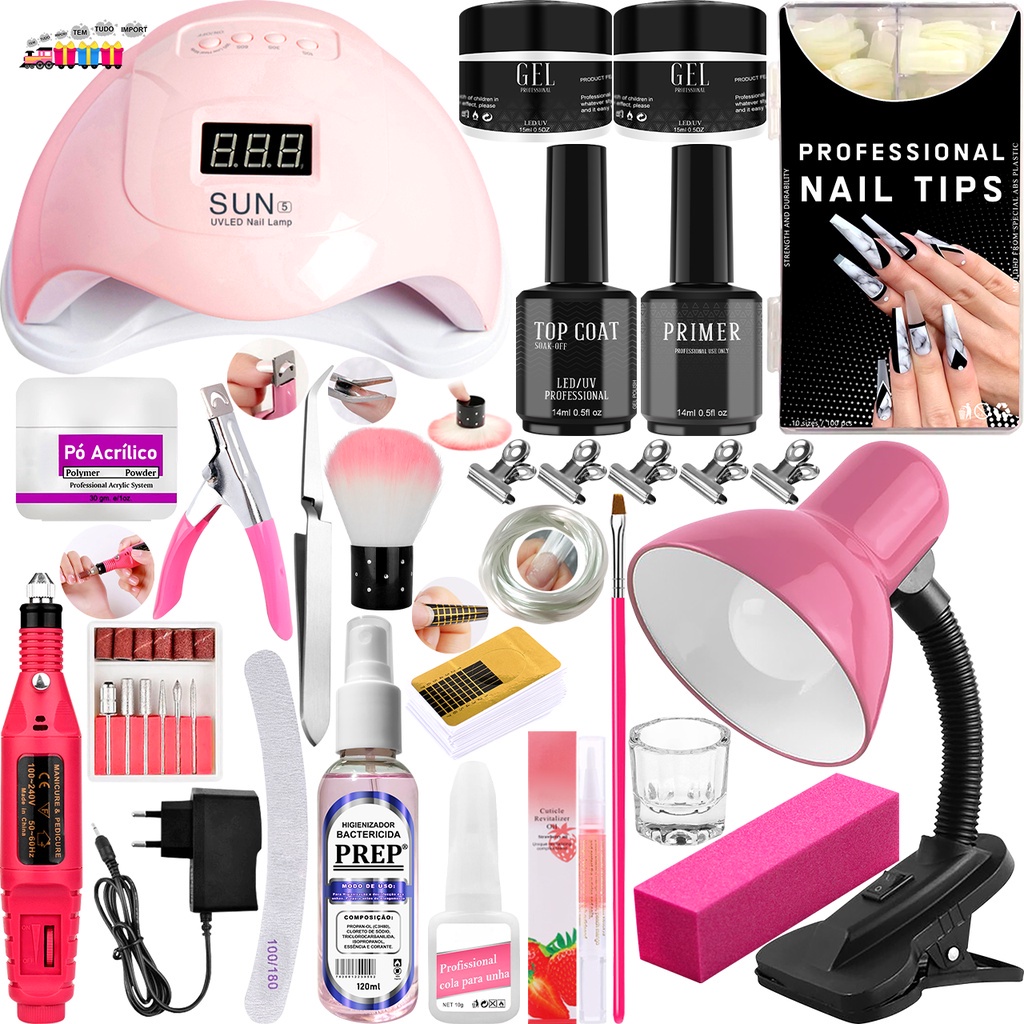 Kit Completo Cabine Sun 5 48W Lixadeira Elétrica Caneta Luminária de Mesa com Garra Pedicure e Manicure para Alongamento Extensão Unhas Porcelana Gel Acrigel