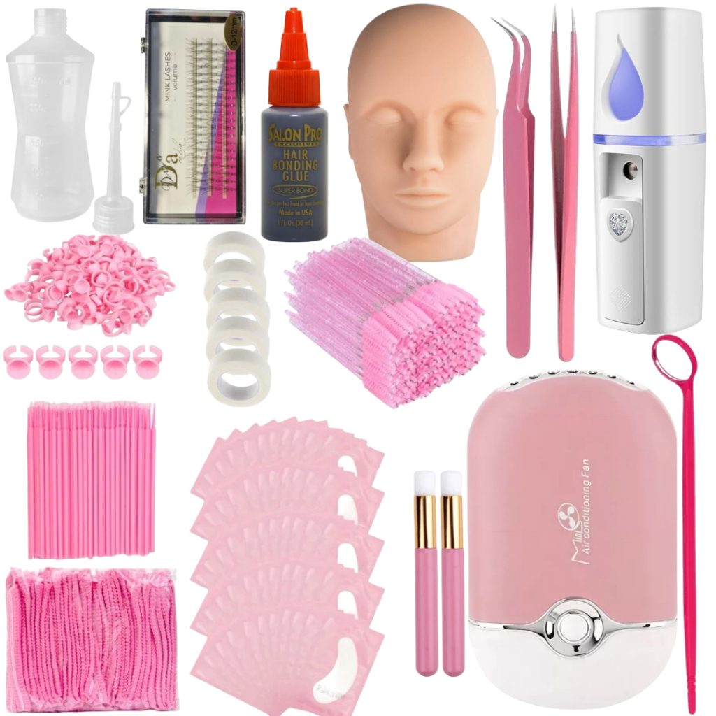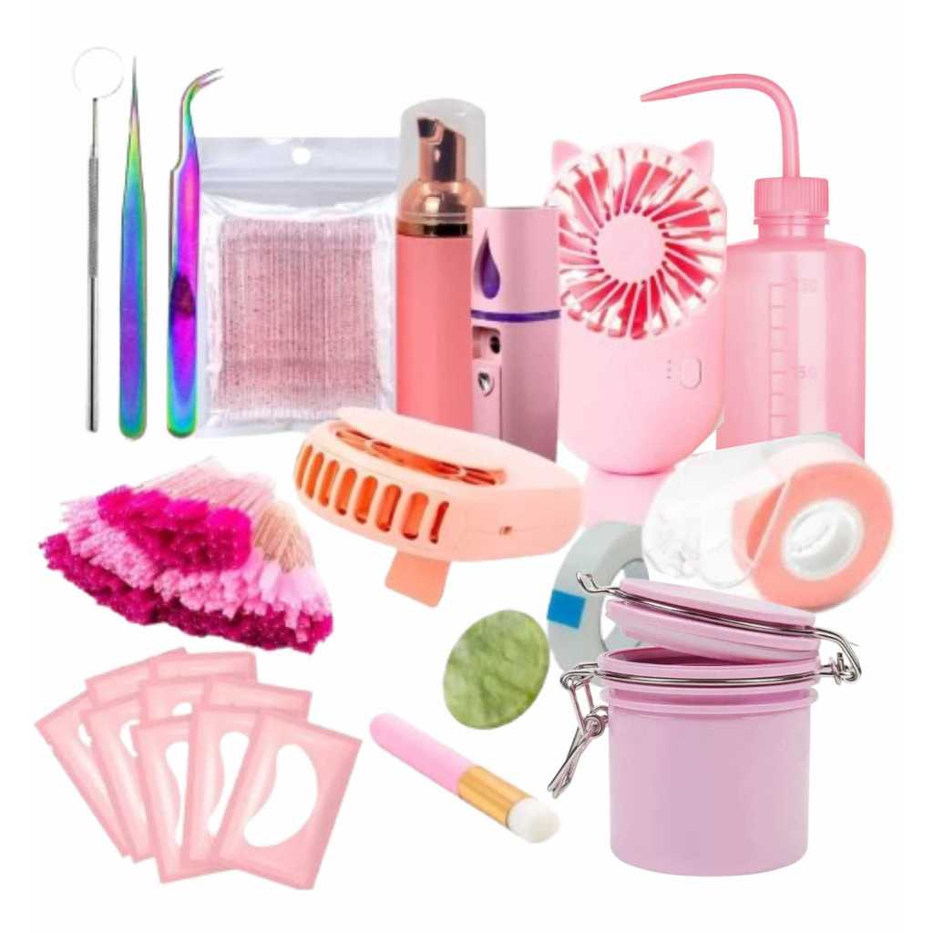Kit Completo Iniciante Treino Extensão e Alongamento Cílios Shampoo Loveyes Ventilador Nano Spray Pinça Vetus Pisseta Pump Porta Micropore