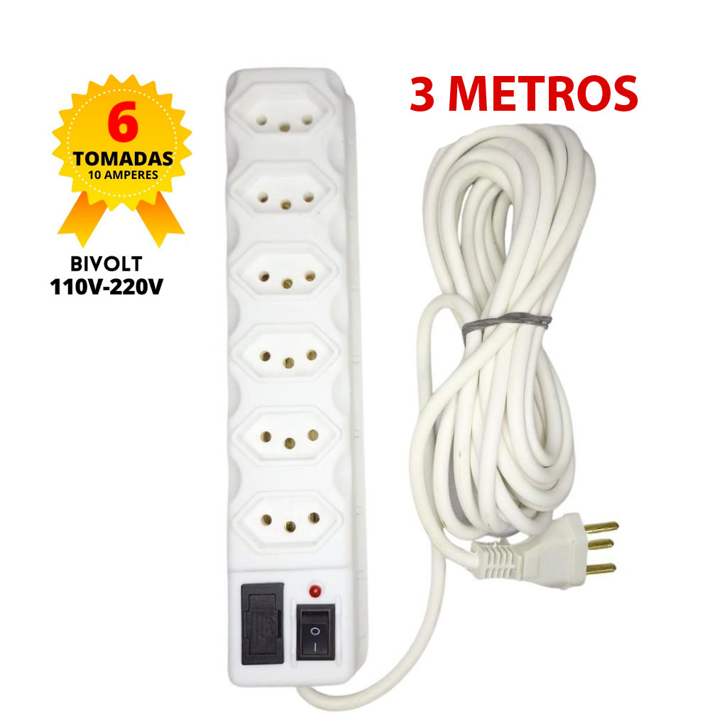 Filtro de Linha 3 Metros de Cabo Branco Varios Tamanhos Regua Eletrica Bivolt Tripolar 10A Pronta Entrega