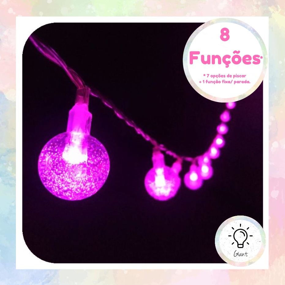 Varal Luminoso 40 Bolinha Cristal Acrílico LED Luz Rosa 5m Pisca Natal Luxo Especial Decoração de Festas Natalinas Eventos
