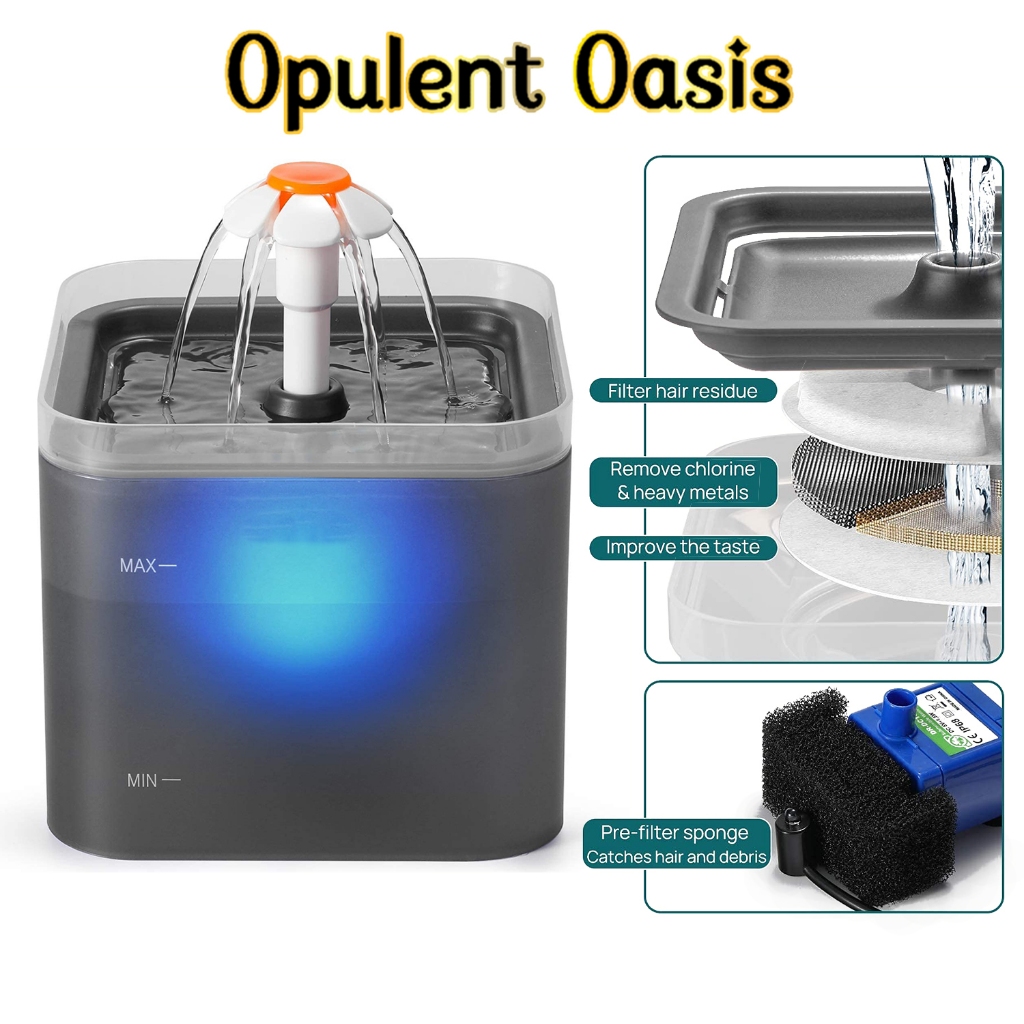 Opulent Oasis>>Fonte para gatos, fonte ultra silenciosa para gatos de 2 litros com luz LED