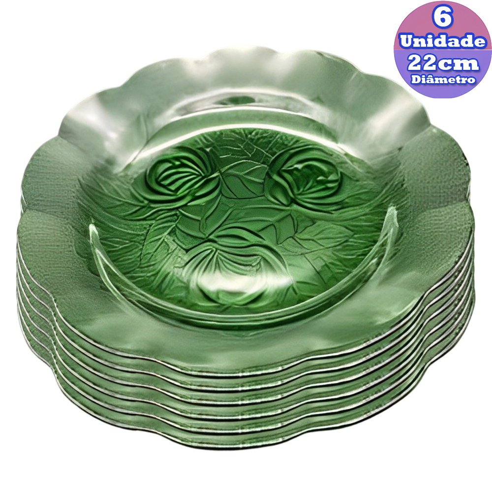 Jogo de 6 Pratos de Vidro Fundo Liso e Decorado 22 cm Almoço Jantar Mesa Transparente