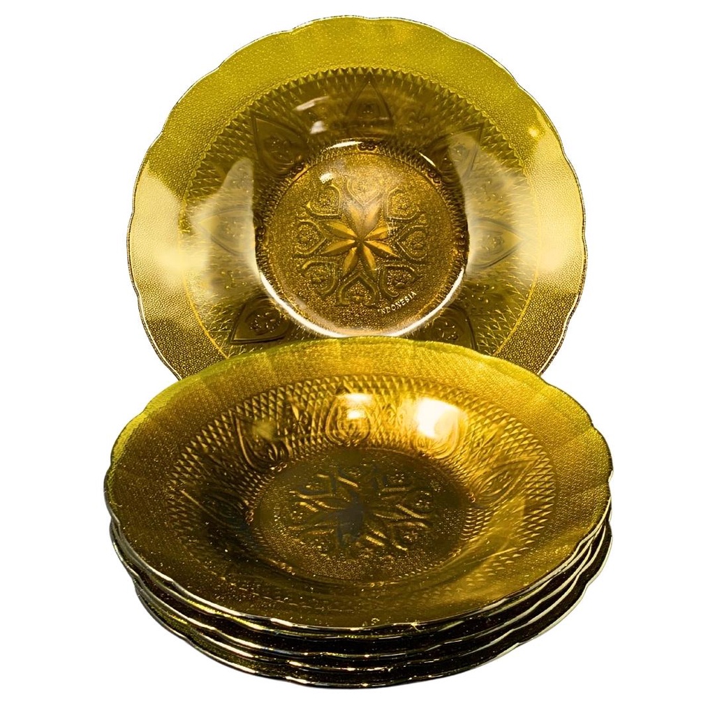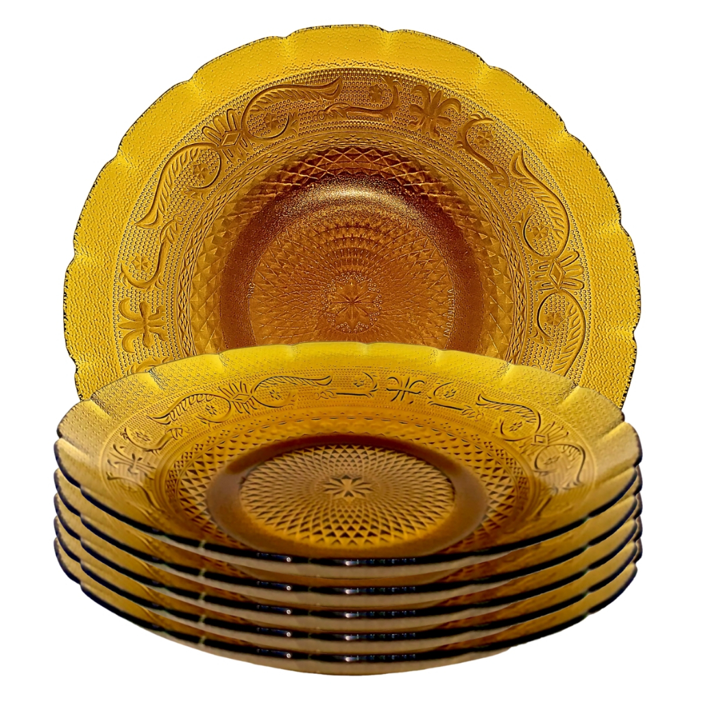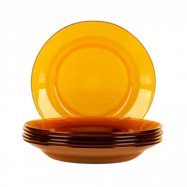 Jogo com 6 pratos fundos de vidro transparente ambar desenhado