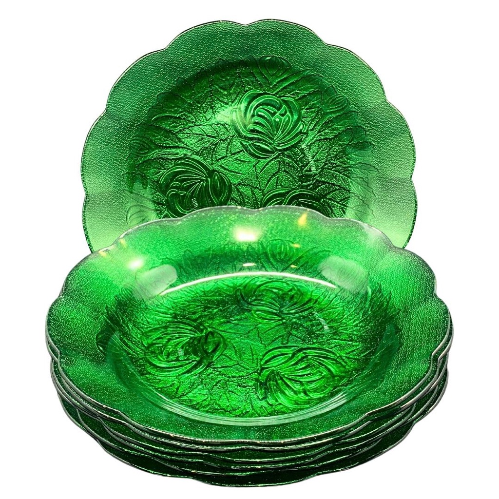 Jogo com 6 pratos fundos de vidro transparente verde flores